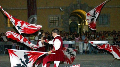 Buongiorno! Il weekend estivo ci ha fatto riposare ed andare al mare, e già non vediamo l'ora che arrivi il prossimo fine settimana! Ed allora vi anticipiamo sin da oggi l'appuntamento per il prossimo weekend.Vi abbiamo parlato nei giorni scorsi del più importante evento ascolano, la Quintana, e vi avevamo anche raccontato che i veri protagonisti della Quintana di Ascoli Piceno sono - oltre ai cavalieri e ai cavalli che si contendono l'ambito palio - gli sbandieratori ed i musici! Sono loro che animano i quartieri della città durante tutto l'anno e sono loro che rappresentano i colori del proprio sestieri. Finalmente, dopo un intero anno di allenamenti, sono arrivate le gare!
